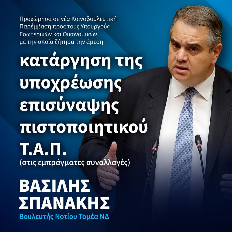 Ερώτηση προς τον Υπουργό Οικονομικών σχετικά με την υποχρεωτική εφαρμογή της πλατφόρμας myData, κατέθεσε ο Βουλευτής του Νοτίου Τομέα Αθηνών Βασίλης – Πέτρος Σπανάκης. Ο κ. Σπανάκης αναφέρει επίσης πως η εφαρμογή της ηλεκτρονικής τιμολόγησης θα […]